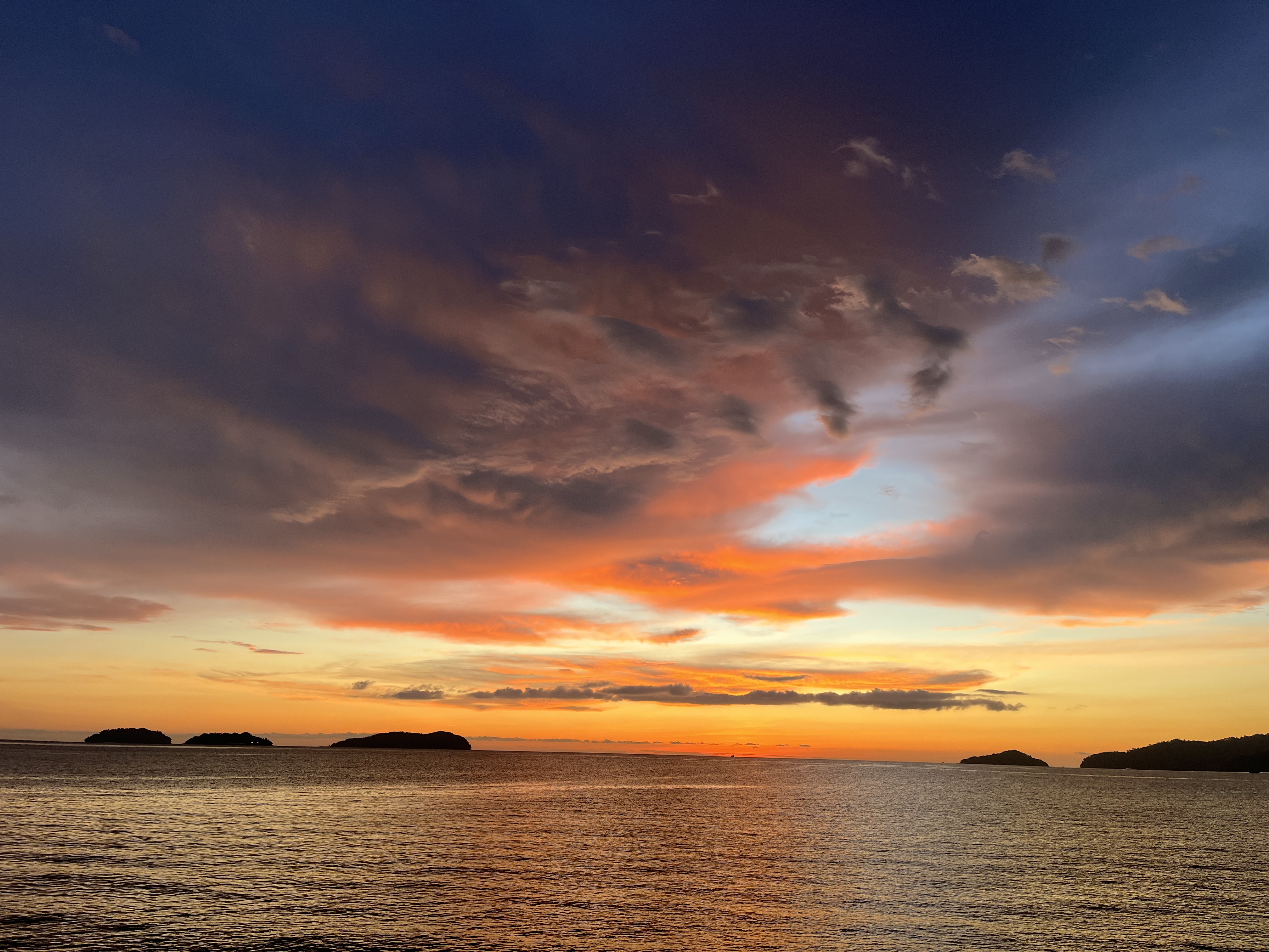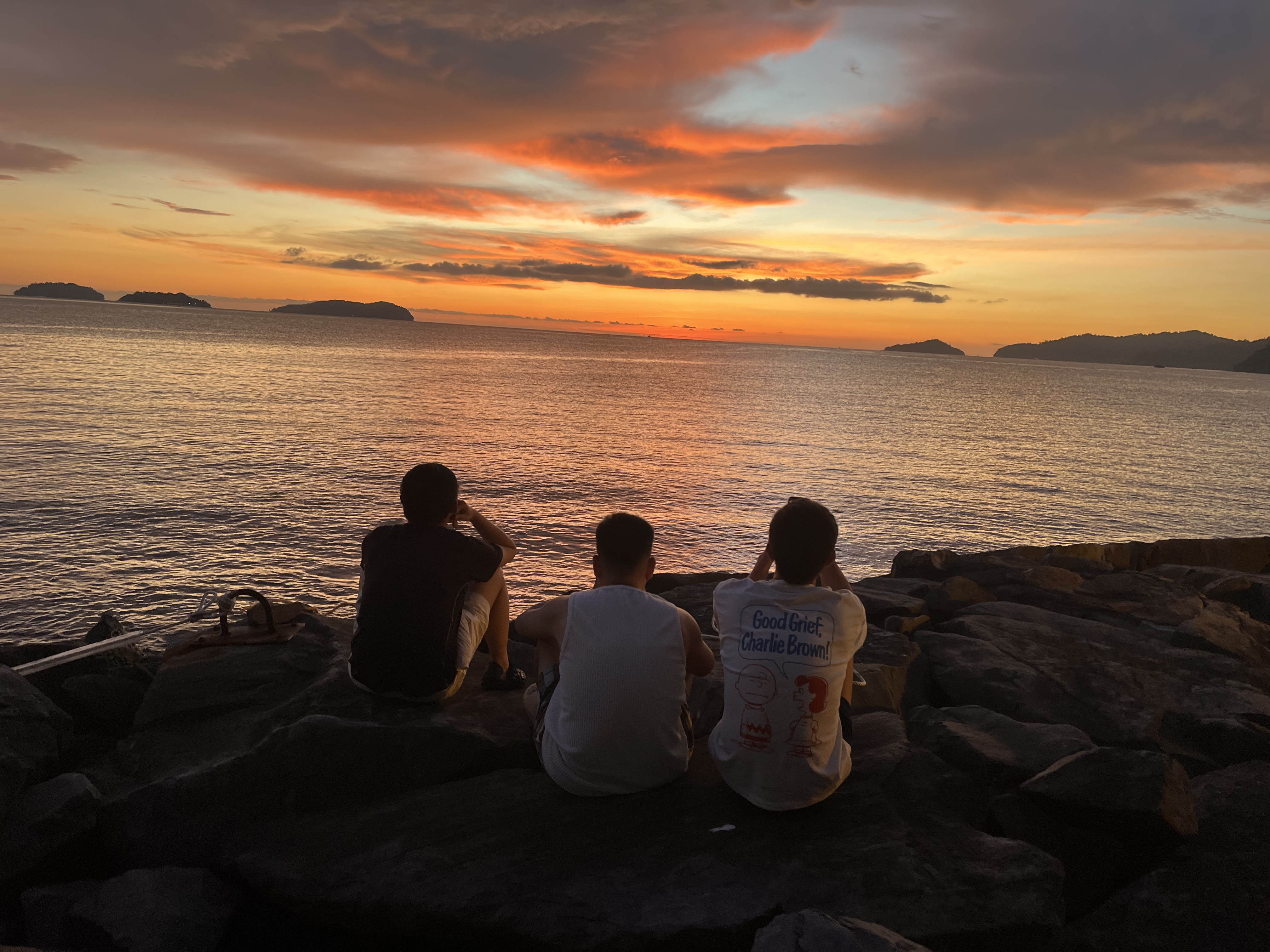 男生组合,是我看到印象最深的那一组。那天正值落日时分,远方的岛屿、天上的云以及缓缓落下的红日构成了一幅绝美的风景,周围的人大部分都在拍照拍个不停,唯独这几位,端坐在岸边的石头上,静静地观赏,享受这难得的瞬间。那一刻,我看到了我心中旅游该有的样子:不是为了特种兵一般段时间内把各种景点刷一遍、东西全吃一遍、照片拍一堆留作纪念,仿佛单位时间内这些东西刷的越多,这趟旅行的性价比越高,连玩乐享受都匆匆忙忙地充满算计…真正的旅游应该是抛开平日里的那些紧张、压力或者消极的情绪,融入这片大自然馈赠与你的安宁。那个时候脑子里就是东坡先生的这句: